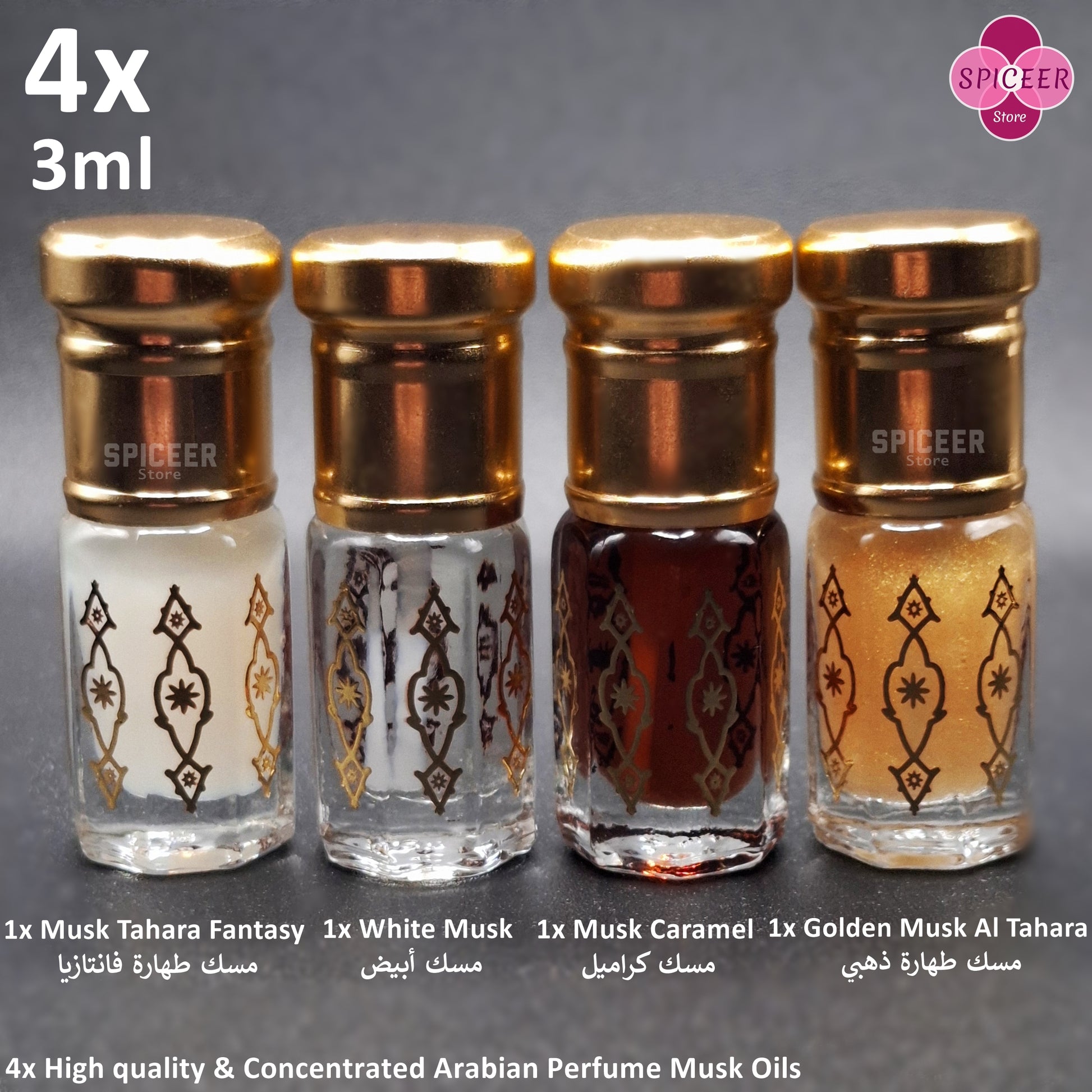 4x Arabic Perfume Gold Musk Tahara 3ml Caramel, White Musk, Fantasy High Quality مسك الطهارة Wonderful Collection
