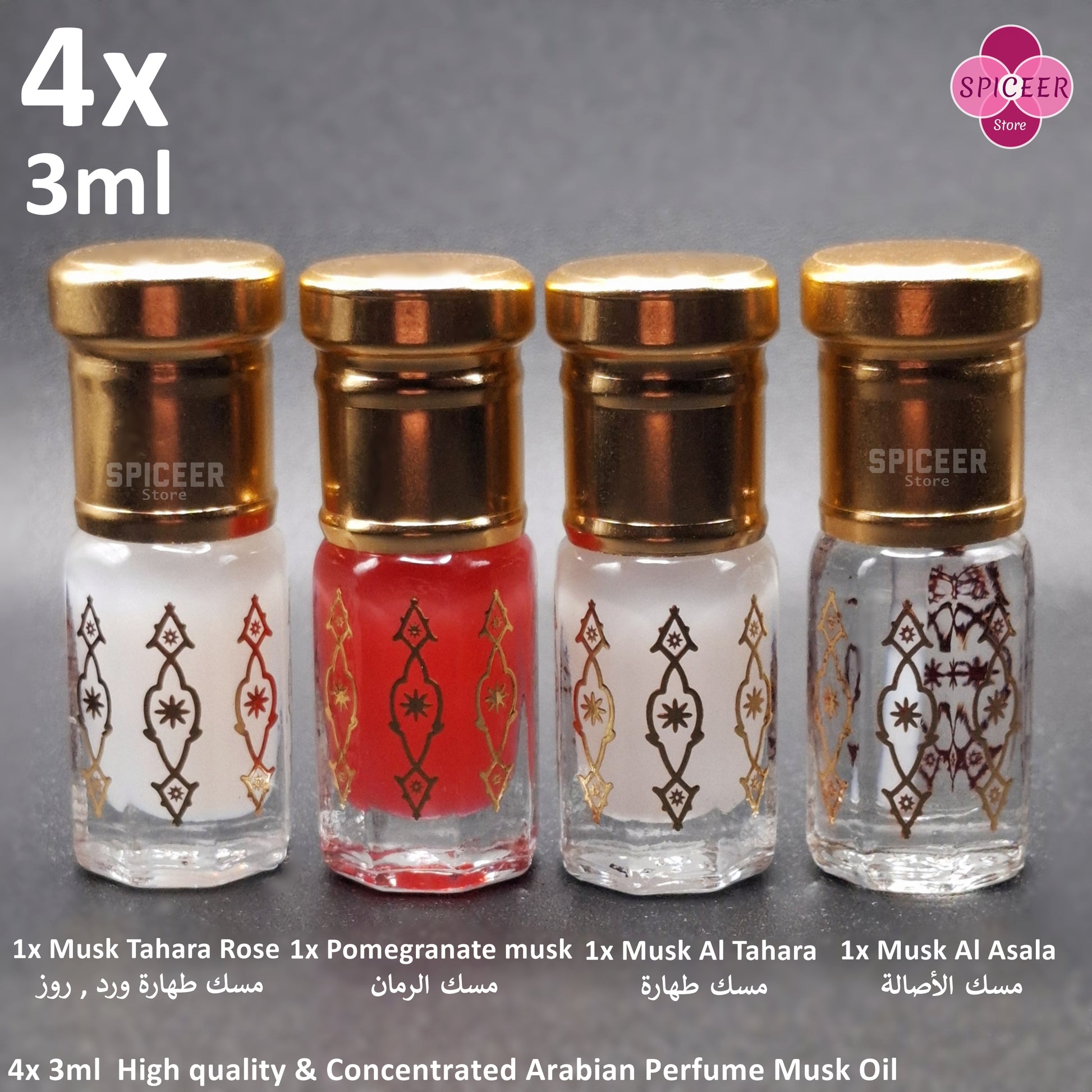 4x Arabic Perfume Musk Tahara 3ml Pomegranate, Al Asala, Rose, High Quality مسك الطهارة Wonderful Collection